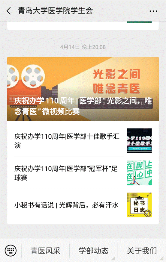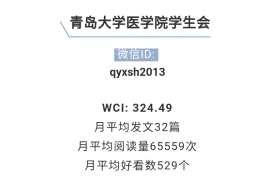 青岛大学新媒体平台2018年度评选,是以《青大校内微信影响力月度排行榜》中诸多指标为依据,包括综合微信推送发布频率、总阅读数、平均阅读量、总好看数、WCI(微信传播指数)等,再利用大数据分析测算,并综合考量多方因素。最终,包括医学部学生会微信公众号在内的15个单位微信公众号获奖。
