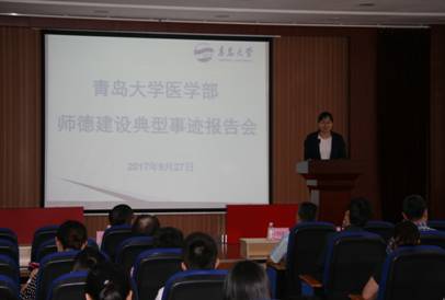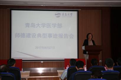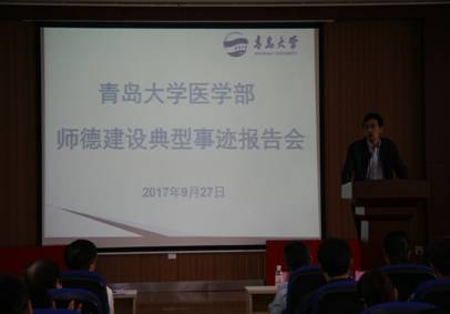 医学部在长期的办学过程中,坚持立德树人,以“四有”教师为标准,持续加强师德建设,教育和引导广大教职工立足本职,切实承担学校教育事业改革发展中的光荣使命,涌现出了一批师德建设的先进单位和先进个人。报告会上,任洪彦书记宣读医学部获得的青岛市、青岛大学工会的表彰名单,并向受表彰的单位和个人颁发奖牌和证书。校十佳教师金利新副教授,校最美教师和师德标兵姜云霞副教授,校教育先锋王威教授,退休教师代表、青岛大学师德标兵、青岛大学督学杜卫教授分别结合自身的经历,依次作典型事迹报告,从不同侧面、不同角度讲述了在各自岗位上践行师德规范、履行教书育人职责的经历和体会。报告会的气氛在老师们饱含深情、声情并茂的演讲中,一次次被推向高潮,深深地打动了在场的每一位老师,他们所表达的“三个爱”的理念,即爱学校、爱岗位和爱学生,折射出了崇高的师德师风和爱岗敬业、热爱学生、无私奉献的时代精神。