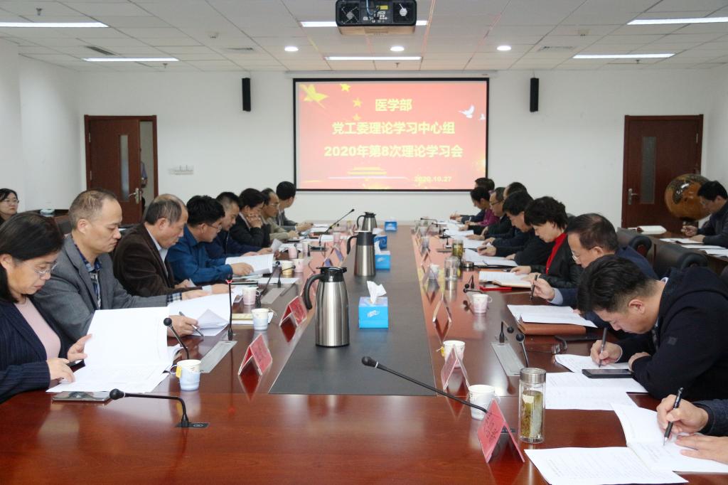 10月27日下午,医学部党工委在浮山校区浩园医学教育综合楼215会议室召开理论学习中心组(扩大)2020年第八次学习会,医学部党工委书记王新生主持会议并讲话,医学部党工委理论学习中心组(扩大)全体成员参加学习。