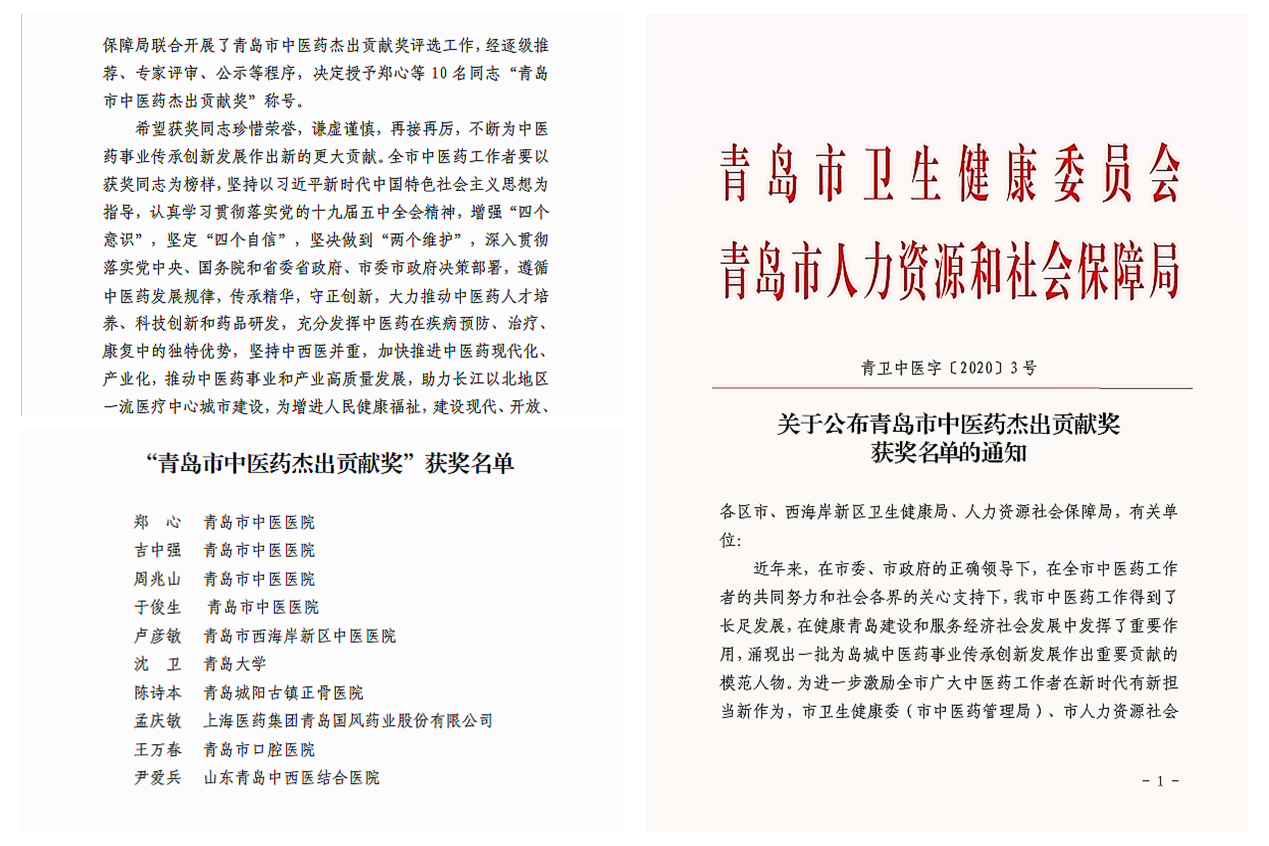 近日,为进一步激励全市广大中医药工作者在新时代有新担当新作为,青岛市卫生健康委(市中医药管理局)、市人力资源社会保障局联合开展了青岛市中医药杰出贡献奖评选工作,经逐级推荐、专家评审、公示等程序,青岛市共授予 10 名同志“青岛市中医药杰出贡献奖”称号,青岛大学医学部沈卫教授获此殊荣。