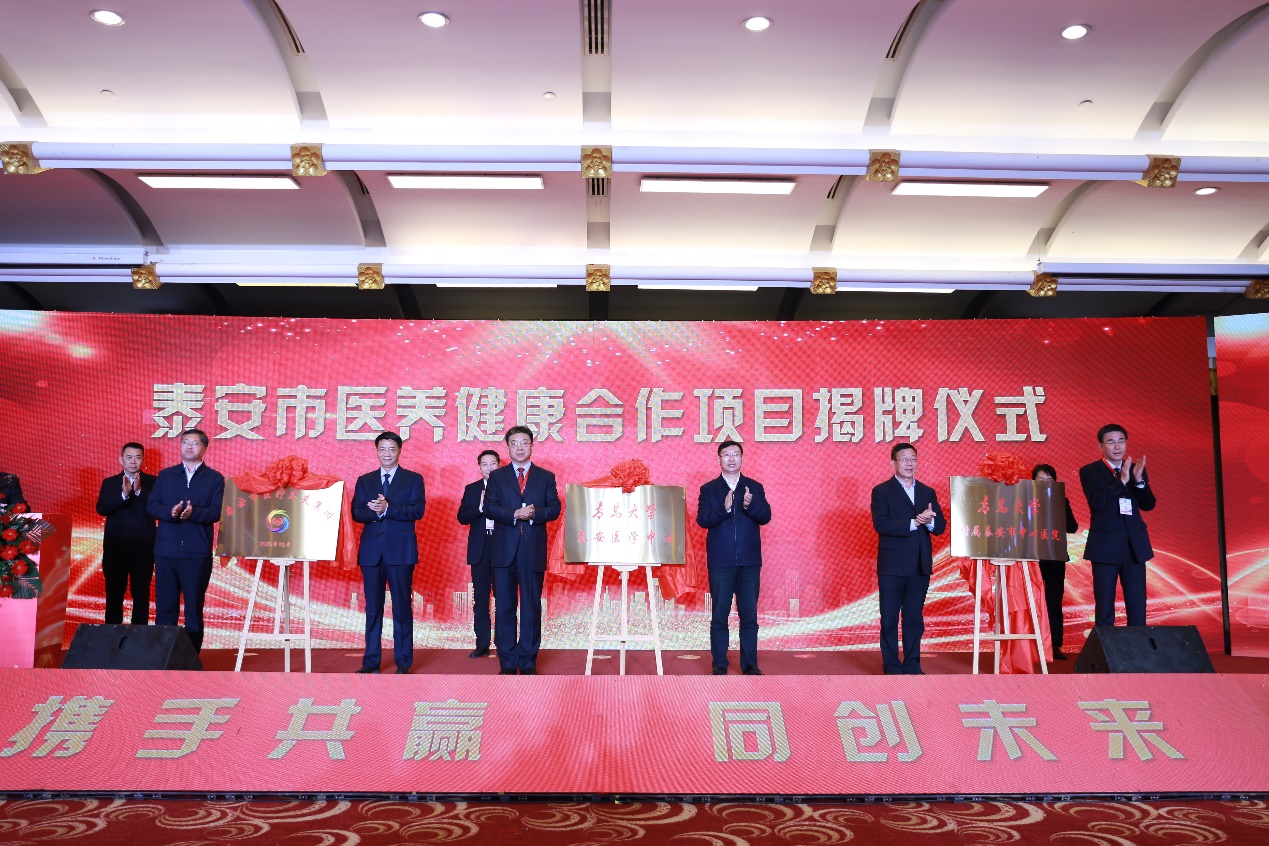 11月21日上午,我校与泰安市人民政府在泰安市医养健康合作项目集中签约暨医疗发展集团揭牌仪式上,签署共建“青岛大学泰安医学中心”战略合作协议,并将泰安市中心医院纳入直属附属医院管理体系,青岛大学附属泰安市中心医院正式揭牌。