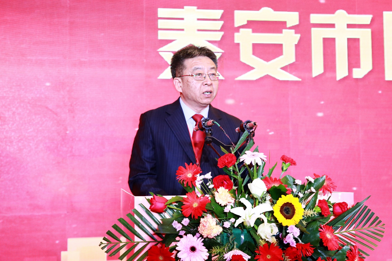 于永明在仪式上致辞。他代表学校祝贺协议的签署并感谢一直以来关心支持学校和医学事业发展的泰安市委市政府以及各界人士。于永明表示,此次签署战略合作协议,开启了与泰安市校地合作的新篇章,是双方紧密对接国家和区域医学中心建设目标,推进全链式医学中心建设,促进大医学产业成果转化,带动区域医学发展、医学原始创新和医疗服务能力的重要举措。通过“医科+医院”的共建模式,真正实现优势互补、共建共享、互利共赢,将助力推进泰安市全国城市医联体建设和“健康共同体”全国示范区创建,全面提升服务泰安市医药卫生与健康水平,为广大人民群众的健康福祉,为国家卫生健康事业发展作出更大的贡献。