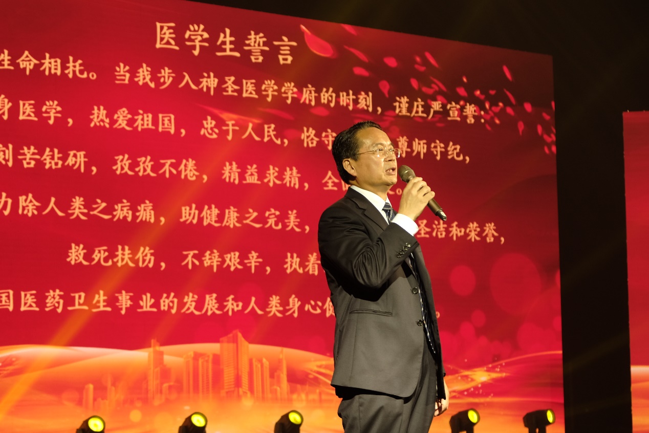 全国先进工作者、“中国好医生”、山东省优秀共产党员、山东省抗击新冠疫情先进个人、山东省医师奖、山东省防治非典工作个人一等功、青岛市五一劳动奖章等荣誉称号获得者,青大附院呼吸与危重症医学科主任于文成教授带领毕业生们重温《医学生誓言》。全场铿锵有力的誓言再次宣告了医学生坚定的从医决心,更体现了对未来医学之路的美好憧憬。