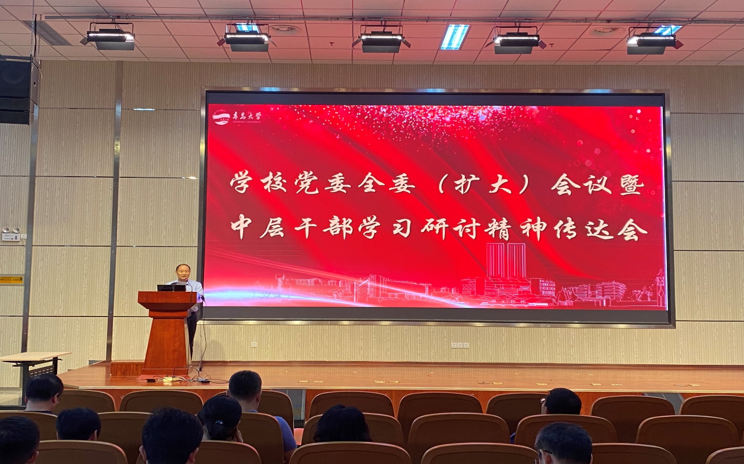 王有全传达了校党委书记胡金焱在三届七次全委(扩大)会议上作的《凝心聚力 争创一流 全力开创高水平综合性研究型大学建设新局面》工作报告精神,就全力做好抓严疫情防控、抓实党史学习教育、抓牢党建工作和抓好学校事业发展作出部署。从统一思想、凝聚共识,党建引领、汇聚力量,聚焦发展、争创一流,关注成长、锻造团队,根植文化、共建家园等五个方面传达了《统一思想,凝心聚力,科学谋划“十四五”发展》的学校暑期中层干部研讨班主旨报告精神,对学校新的发展定位和发展思路进行了系统阐述。