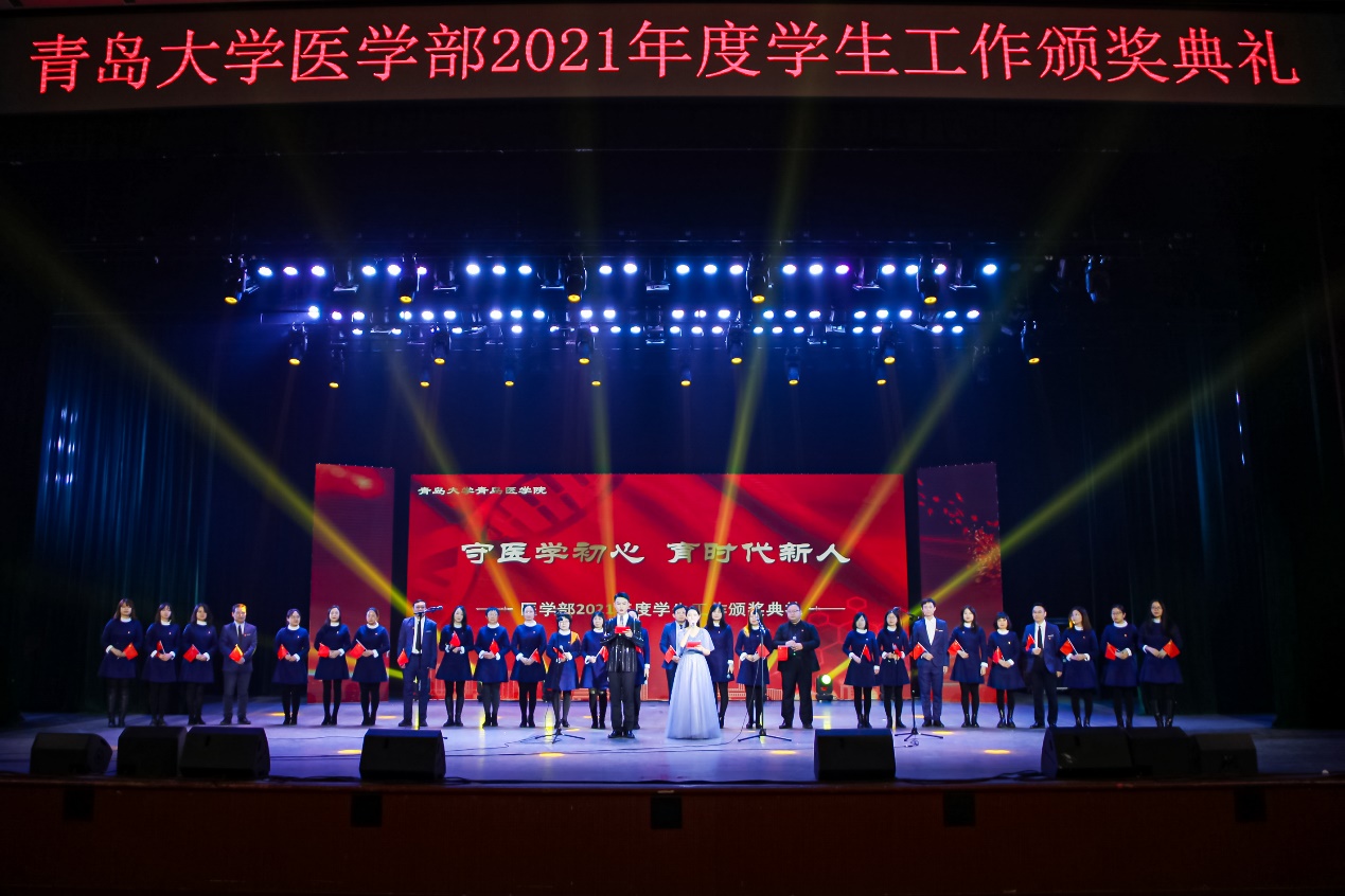 12月15日18:30,青岛大学医学部“守医学初心,育时代新人”2021年度学生工作颁奖典礼在青岛大学剧院举行。校党委常委、副校长、医学部部长姜宏,学生处处长解涛,校合作发展处副处长、校友工作办公室副主任霍光耀,校团委副书记李鹏,医学部党委书记、附属医院党委书记、理事长王新生,医学部及各学院的党政领导、全体辅导员、班主任代表、教师代表及学生代表出席颁奖典礼。