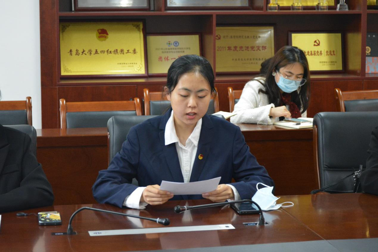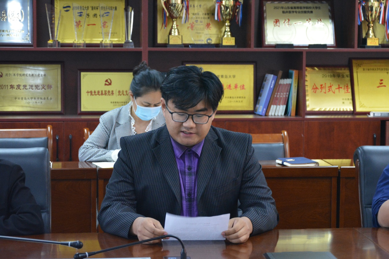 学生代表2020级临床五年制本科生李欣然表示,在中国共产党建党百年这一光辉的历史时刻之后,我们又迎来了中国共产主义青年团一百周年诞辰,历经百年栉风沐雨,共青团始终坚定不移跟党走,团结带领共青团员和广大青年为中国的青年运动书写了绚丽的华章。习近平总书记曾寄语青年:“对想做的事要敢试敢为,努力从无到有,从小到大,把理想变为现实。”作为青年一代的我们,要坚定不移跟党走,肩负起自己的责任和担当。而作为团支书的我,也要从自身做起,积极带动身边的同学,树立起坚定的理想信念!“青春须早为,岂能长少年”。未来,青大学子必将用青春之力承载起国家和民族的光明未来!
