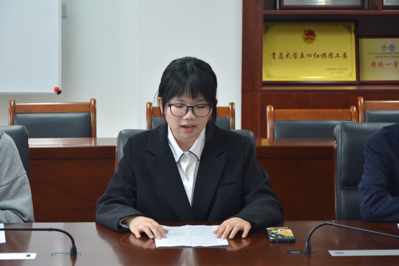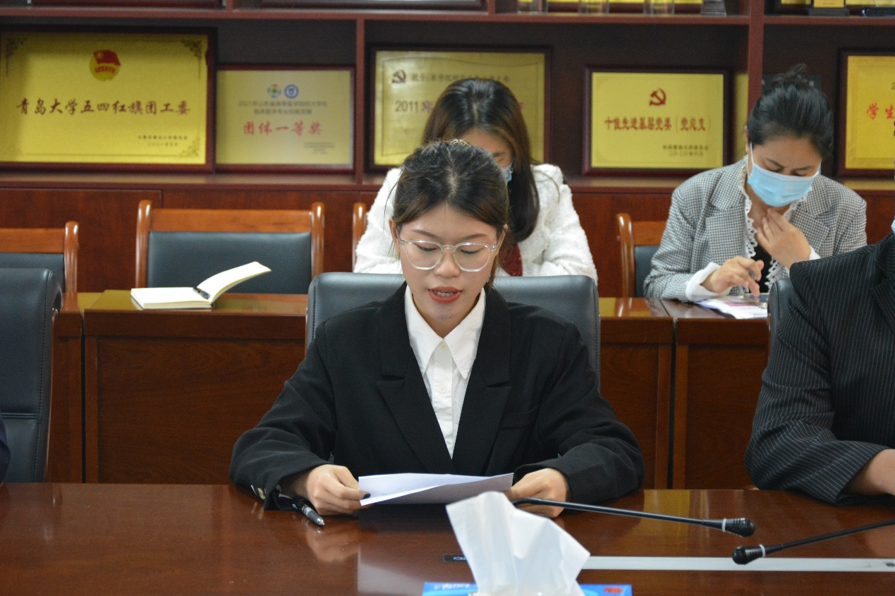学生代表2020级预防医学本科生崔芸表示一代人有一代人的长征,一代人有一代人的担当。作为五四运动的缘起地,“青春心向党 建功新时代”的号角正在青岛遍地吹响,无数青年团员心怀伟大梦想,面对鲜红旗帜,许下“请党放心,强国有我”的铮铮誓言。习近平总书记强调:“时代总是把历史责任赋予青年。新时代的中国青年,生逢其时,重任在肩,施展才干的舞台无比广阔,实现梦想的前景无比光明。”我们生在一个伟大的时代,应当心怀伟大梦想,成长为有理想、敢担当、能吃苦、肯奋斗的新时代好青年,在青春的赛道上奋力奔跑,用青春的智慧和汗水为建设更加美好的中国贡献一份微薄的力量。