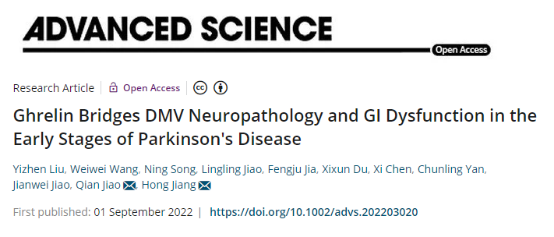 帕金森病(Parkinson’s disease,PD)是全球第二大神经退行性疾病,我国60岁以上人群的发病率是1.37%,随着我国步入人口老龄化社会,其患病人数逐年增加。近日,基础医学院姜宏教授团队于《Advanced Science》(中科院期刊分区1区,IF=17.521)在线发表了题为Ghrelin bridges DMV neuropathology and GI dysfunction in the early stages of Parkinson's disease的研究成果。该研究得到了国家自然科学基金委、山东省自然科学基金委、山东省科技厅和泰山学者工程等的资助。基础医学院生理学研究生刘一臻、王维维和基础医学院宋宁教授为第一作者;姜宏教授和焦倩副教授为该论文的共同通讯作者。