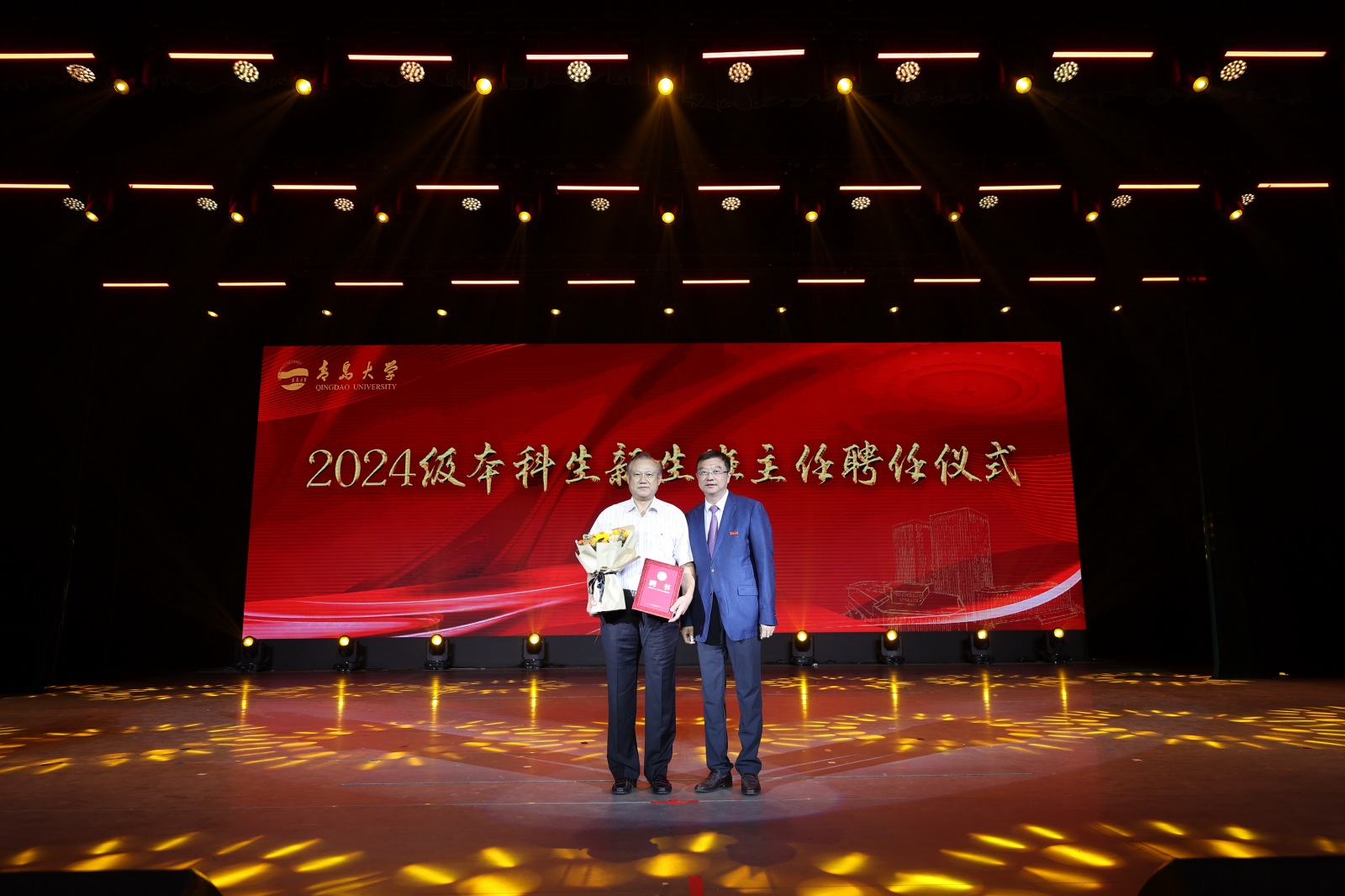 青岛医学院副院长李冰为2024 级本科生新生班主任颁发聘书。党委书记蒋光峰为临床医学“5+3”一体化沈福彭班校外班主任沈毅教授颁发聘书。