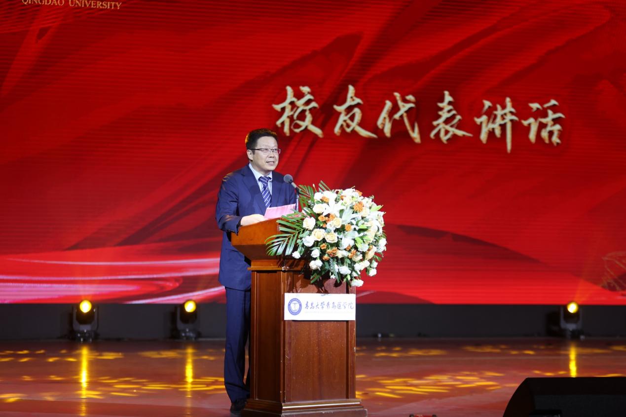 董蒨教授作为校友代表发言。他是青岛医学院1984届校友,曾担任青岛大学附属医院院长、青岛大学医疗集团总院长,还是泰山学者攀登专家、博士生导师。董教授深情回忆当年的大学生活,讲述自己的工作经历,寄予新生殷切的期望和美好的祝愿。