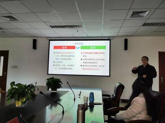 周鑫教授做了题为“分子探针与生物影像—从分子设计到应用探索”的学术报告。他首先从荧光成像研究现状、个人研究经历以及医学合作前景三个方面进行了介绍。随后大家围绕荧光成像技术在药物的细胞内定位与功能、临床重大疾病的早期检测和诊断、新型荧光染料与标记、临床检测仪器开发等方面的应用,展开了充分的讨论,纷纷表示很受启发,收获良多。下一步有望通过新化学反应技术和新分子工具,研究生命过程可视、可控、可创造的进程,在细胞化学修饰,蛋白质、抗体、外泌体标记,亚细胞器靶向染色等方面实现合作。