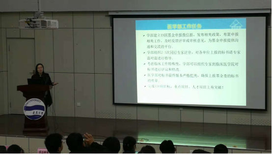 随后.科研管理与国际合作办公室主任李冰布置2019年基金申报工作。最后医学部常务副部长万芪鼓励医学部各位教师及科研人员积极谋划,认真做好项目组织申报工作,精心撰写项目申请书,力争在重点重大项目方面取得突破。