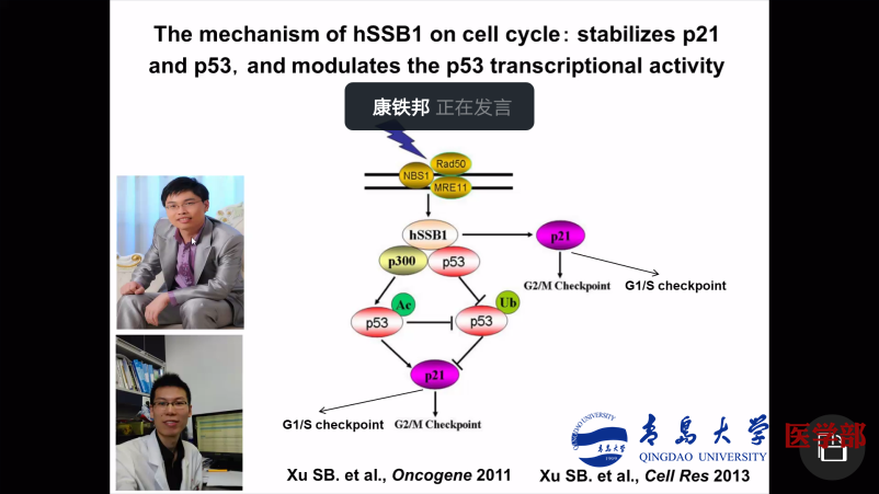 康铁邦教授做了题为“SSB1在细胞周期中的作用及其调控”的学术报告。报告主要围绕细胞周期检验点调控、SSB1不同的翻译后修饰参与细胞周期和DNA损伤调控的分子机制,及这一机制在癌症治疗中的潜在作用。报告结束后,与会师生与康教授就部分研究内容进行了深入的讨论,气氛活跃。该报告拓宽了大家的科研思路,为今后的科研合作奠定了良好的基础。
