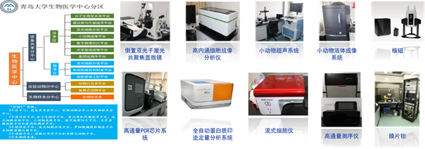 学部拥有2个国家级实验室,8个省部级重点实验室,4个省级临床医学研究中心。青岛大学生物医学中心,分为设备共享平台、实验动物中心、生物样本库三个部分,设备共享平台按照功能又分为10个子平台,能够满足生命科学前沿研究的各项需求。