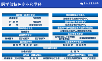 眼科学为国家重点学科,生理学为国家重点培育学科,骨科为国家临床重点专科,此外,学部有山东省“十二五”重点学科5个,省级重点实验室15个,国家级实验教学示范中心2个,国家级人才培养模式创新试验区2个。临床医学、生物学和神经科学与行为学获批山东省一流建设学科,临床医学获批山东省筑峰计划学科。临床医学和基础医学获评山东省高水平建设学科。临床医学、神经科学与行为学、药理学与毒理学、生物学与生物化学、分子生物与遗传学进入ES|全球排名前1%,临床医学进入全球排名前2‰。