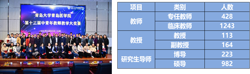 学部有专任教师428人,其中教授113人,副教授164人。有中国工程院院士2人,外聘院士7人,长江学者、国家杰青、国家优青等国家级人才30余人,泰山学者、省杰青和省医学领军人才等省级人才70余人。