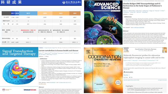 2017年至2021年,学部获批国家科学技术进步二等奖1项,省级科技进步奖一等奖2项、二等奖12项、三等奖9项;发表医学相关学科SCI高端学术论文医学部8907篇,高被引论文29篇,专利1283项,获得国自然基金383项,获批国家重点、重大项目21项。医学部2022年共获国家自然科学基金资助88项(集中期),其中面上项目35项、青年科学基金52项、李长贵教授获批国际(地区)合作与交流项目1项。创办痛风领域QINGDAO MEDICAL COLLEGE唯一全英文期刊《GOUT AND HYPERURICEMIA》和全国唯一的《精准医学杂志》,《青岛大学学报(医学版)》、《精准医学杂志》面向国内外公开发行。
