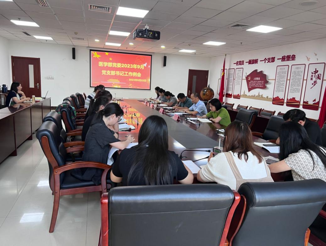 为进一步做好医学部党委新学期党建工作,9月22日下午,医学部党委在浩园医学教育综合楼A215会议室召开党支部书记例会。会议由医学部党委常务副书记王有全同志主持,党委副书记邱慧青、刘学,组织员沈贵荣、机关党总支委员、各党支部书记、研究生辅导员参加会议。