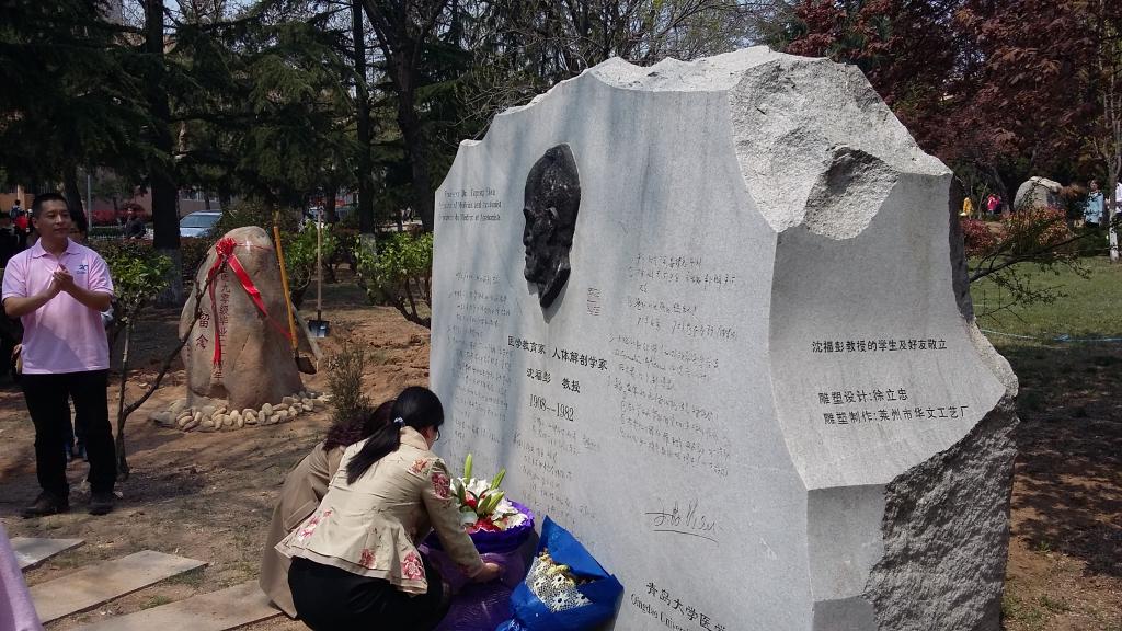 集体合影后,校友们移步博学楼西侧的小花园,向沈福鹏教授雕像敬献了鲜花,并在沈教授雕像旁埋下了纪念碑石,栽下了纪念树。