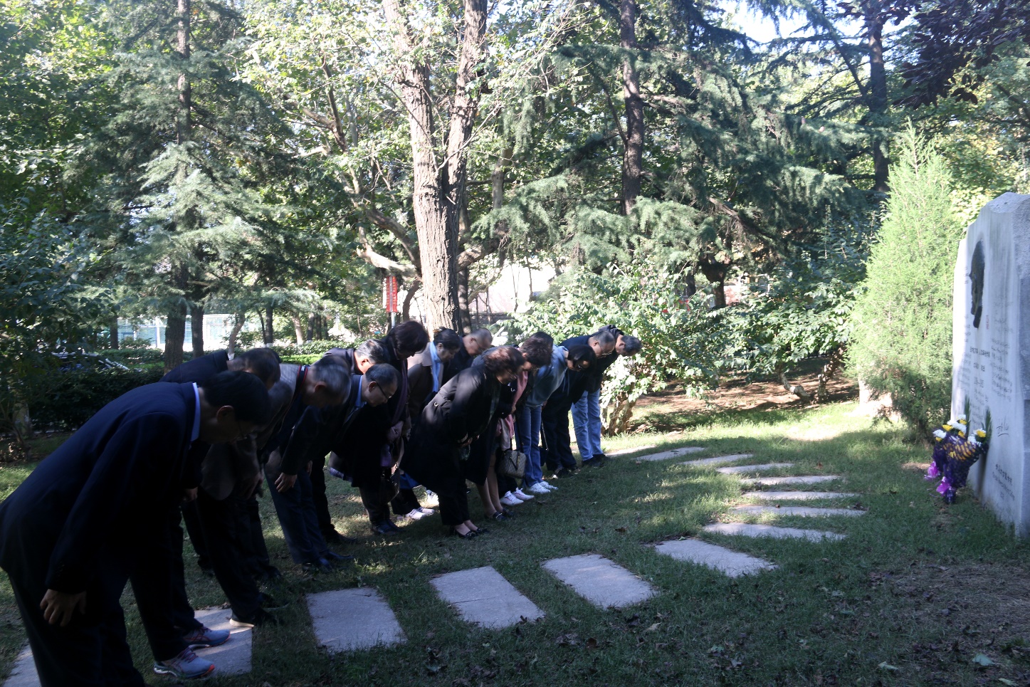 返校后,校友们第一个活动便是到沈福彭教授纪念碑前敬献鲜花,鞠躬缅怀、致敬这位“鞠躬尽瘁、死而不已”的师长前辈,重新感悟大医精诚的崇高品格和行为世范的师德师风。
