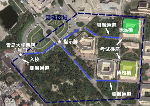 校内设两个考试楼座:博知楼(西四教)、博远楼(西五教)。各考区入口处均设有指示牌。考生持《健康承诺书》和资格审查时所持的有效身份证件、准考证进入候检区,再次检测体温后,提交《健康承诺书》,进入身份验证、指纹检测通道。为保证考生身体健康,请在验证后立即进行手部消毒(现场配备消毒用品)。