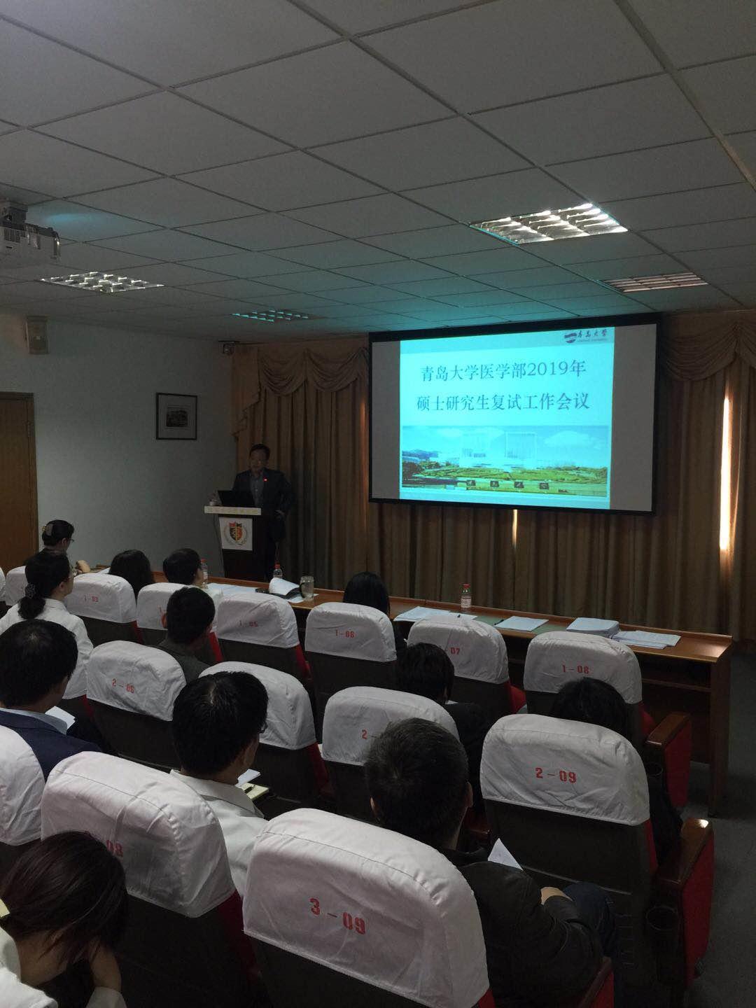 医学部学科建设与研究生培养办公室主任张蓓传达了《青岛大学2019年硕士研究生复试录取工作实施意见》,从复试工作的组织管理、招生计划及成绩要求、复试方式、内容及复试时间安排、录取办法和信息公开等方面详细解读了教育部、山东省教育厅和青岛大学对2019年全日制统招硕士研究生复试工作的具体要求。