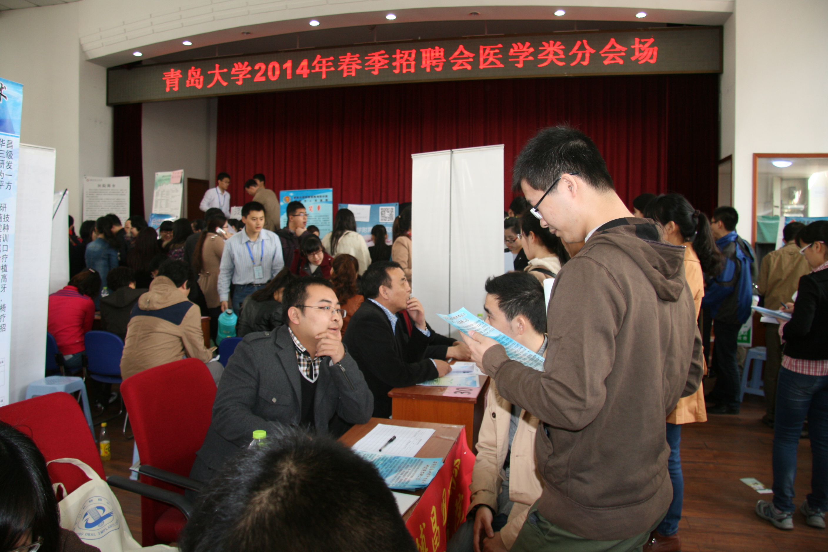 3月28日上午8点半,青岛大学2014届毕业生春季大型供需洽谈会医学类分会场在青岛大学西校区登州路学术报告厅举行。这是青岛大学首次设置供需洽谈会医学类分会场,来自全省各地53家医疗单位齐聚校园,提供就业岗位2300多个,涉及学科有临床医学、医学影像、医学检验、预防医学、口腔医学、药学、护理学等专业。其中烟台海阳地区以及成武地区由当地人社局和卫生局组织本地区医疗事业单位集体参会,并提供现场签约。参加洽谈会的本科生和研究生近800人次。另外,28日下午和29日上午还安排了6家单位进行宣讲、面试、考试等。