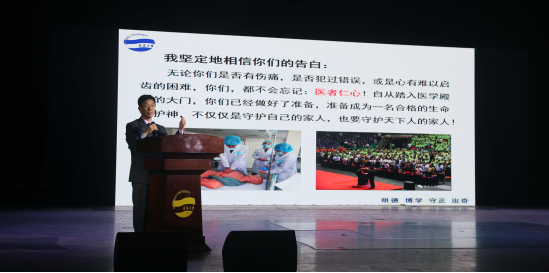 最后,刘成玉为现场700多名医学生做了“行医路上,不忘初心”的演讲。作为医者更应铭记医者初心,仁爱救治,将仁心仁术缩影为高质量的医疗服务,确保医学知识的科学性和医疗技术的严谨性。守护健康、促进和谐,是我们医者担负的神圣使命。我们不仅要收获职业的成功,还将收获职业的幸福。我们坚信,我们的承诺将铸就医学职业的崇高与至善,确保人类的尊严与安康。他希望每一位医者行医路上,不忘初心。他请同学们要真正理解“医学是一门人学,是关系人类幸福的事业,对人的全面关怀为医学应有之意”,和特鲁德医生的墓志铭“有时去治愈,常常去帮助,总是去安慰!”的真正含义。