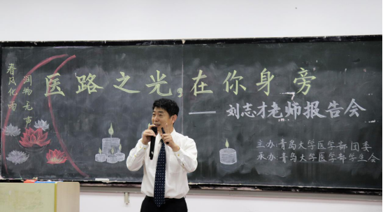 5月30日19:00,医学部 “医路之光,在你身旁”——刘志才老师事迹报告会在博学楼103教室举行。基础医学院人体形态学实验中心实验师单涛担任主讲,医学部团委书记马丰刚及学生副书记许晓晗作为嘉宾出席了报告会。