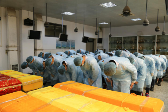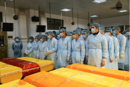 告别仪式上,大家首先将大体老师从解剖台搬出,紧接着清扫解剖台。同学们仔细地清扫每一个角落,充分体现了对于大体老师的尊重。之后,同学们将大体老师搬运至灵柩内。在全部搬运工作完毕后,教师代表单涛老师发言,他指出大体老师是同学们进入临床工作的基石,每一位大体老师都是值得我们献出最真挚的敬意的,他们甘于奉献自己的精神,是激励同学们前行的力量。随后,在场同学用最崇高的礼节向大体老师默哀、鞠躬,表达对大体老师们的深深的哀思和感恩。最后,在缓缓的音乐声中同学们将大体老师的遗体抬至灵车,用满怀感恩的目光,送别大体老师远去。