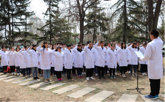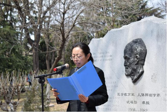 祭奠活动开始后,于文洁在沈福彭教授纪念碑前致悼词,与同学们一同回顾了沈福彭教授的生平,表达了对沈教授崇高的敬意和对新时代医学生提出新的要求,现场气氛庄严肃穆。随后,学生代表怀为沈老献上鲜花,全体师生深深弯腰鞠躬、默哀,向沈老表达缅怀和追思之情。活动尾声,学生代表刘鹏程带领同学们重温医学生誓词,慷慨激昂的宣誓使同学们深深感受到肩上“健康所系、性命相托”的社会责任。