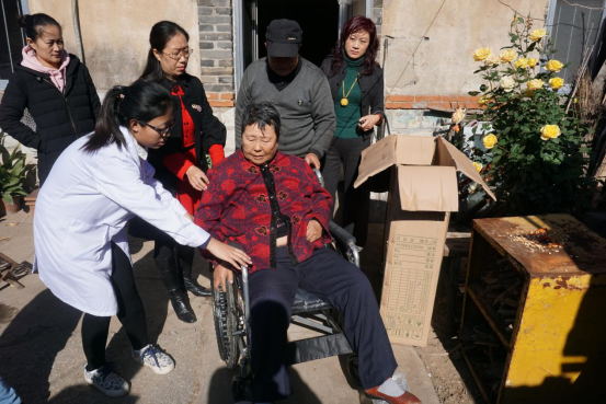 得知村中有因长期患病不能下床、生活困难的老人,宋莉老师携志愿者在村主任的带领下,深入村民家中,送去手动轮椅,并现场指导轮椅使用方法,缓解患者出行难的问题。71岁的王瑞卿老人接到轮椅后流下感动的泪水,不断对志愿者表示感谢。