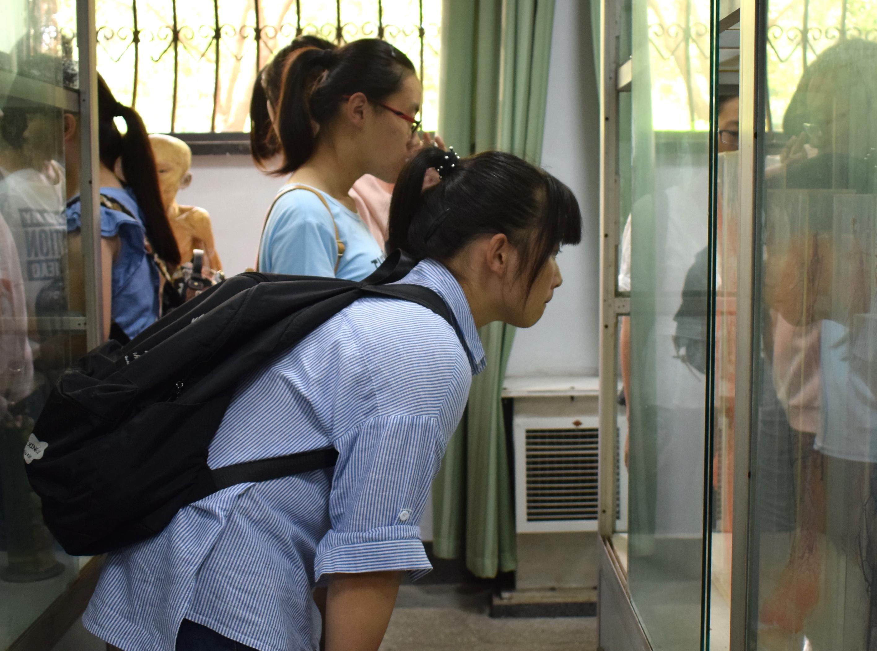 活动时,同学们首先来到沈福彭教授纪念碑前,瞻仰沈教授的塑像和纪念碑碑文。宣讲人讲述了沈老的生平和他与青医深厚的渊源。“一纸遗嘱直如震世春雷,一宗心愿想见哲人气概”,在场同学们不禁为沈老的精神所折服,深深地鞠下一躬。随后,在宣讲人的引领下,同学们来到了博雅楼的解剖标本室,依次瞻仰巍然屹立的沈福彭教授遗骨标本,参观室内陈列的各种珍贵的人体标本、器官标本。同学们屏息无声,认真聆听宣讲人的介绍,俯下身仔细的观察每一个标本,气氛庄重严肃。活动最后,宣讲人还介绍了实验操作和隔离衣使用的注意事项,告诫新生要尊重大体老师和实验动物,珍惜每一次动手实验的机会。
