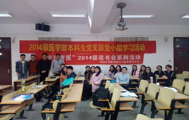 3月26日14:30,医学部本科生学生党支部2014级党小组“学在青医”读书会活动在博学楼108教室举行,医学部2014级学生党员、预备党员以及入党积极分子参加活动。