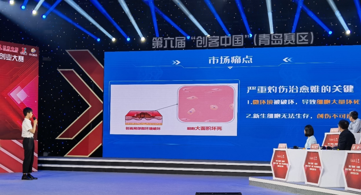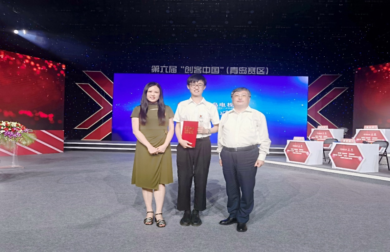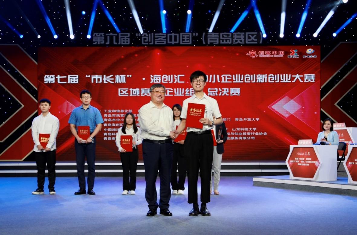 本次大赛共设冠军一名、亚军两名、季军三名。经过激烈角逐,我校医学部徐文华教授指导的参赛项目“肤源奇-4D打印干细胞载体的引领者”脱颖而出,荣获大赛冠军。青岛市副市长耿涛为团队颁奖,项目学生负责人2019级临床检验诊断学硕士研究生王子博代表团队领奖。