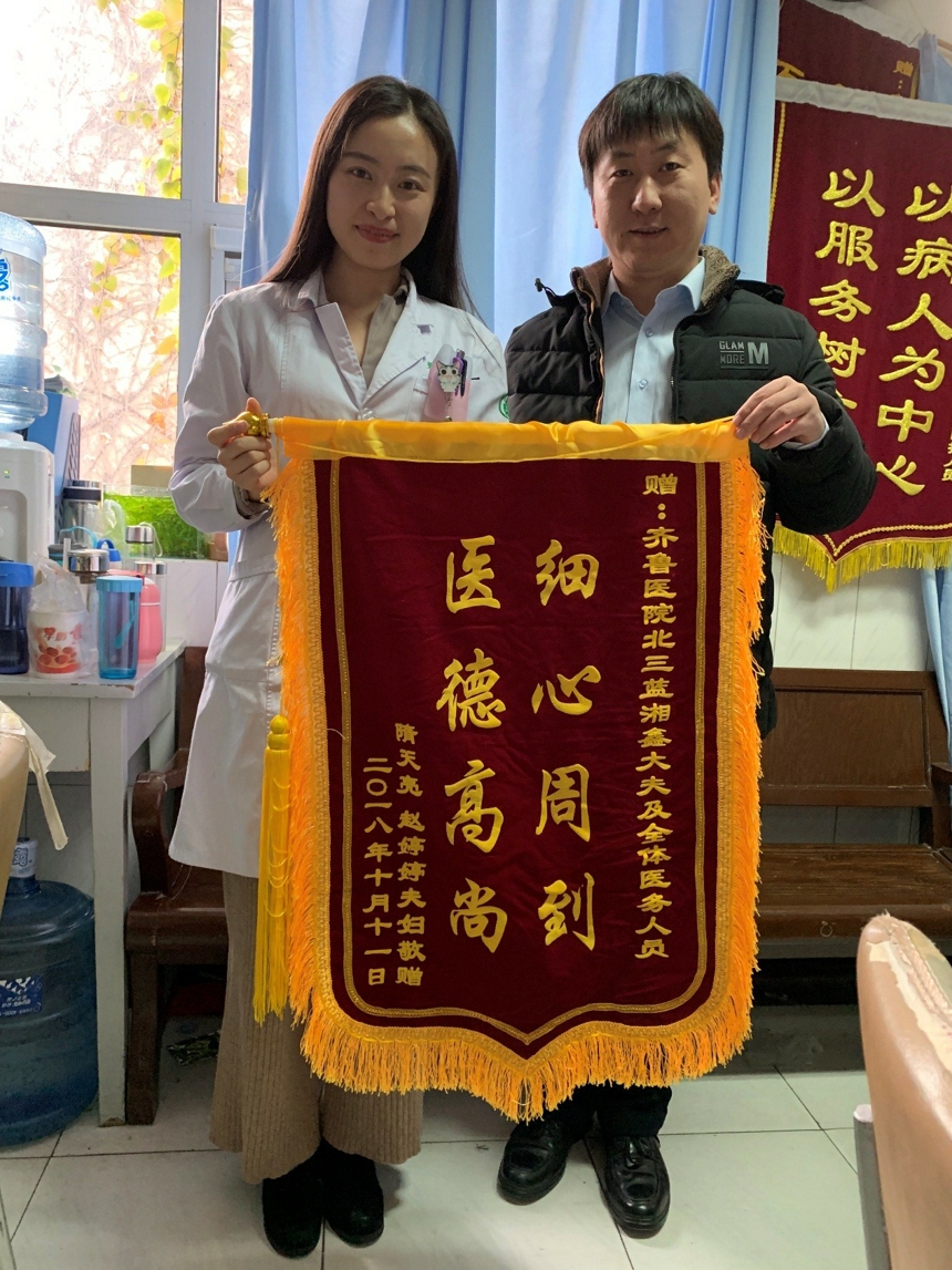 11月23日,小赵及其家属将一面“医德高尚,细心周到”的锦旗送到了蓝湘鑫及北三全体医护人员手中,以感谢他们在小赵住院期间对其的精心呵护与照顾。收到锦旗的时候,蓝湘鑫正在为一名新入院的产妇查体。