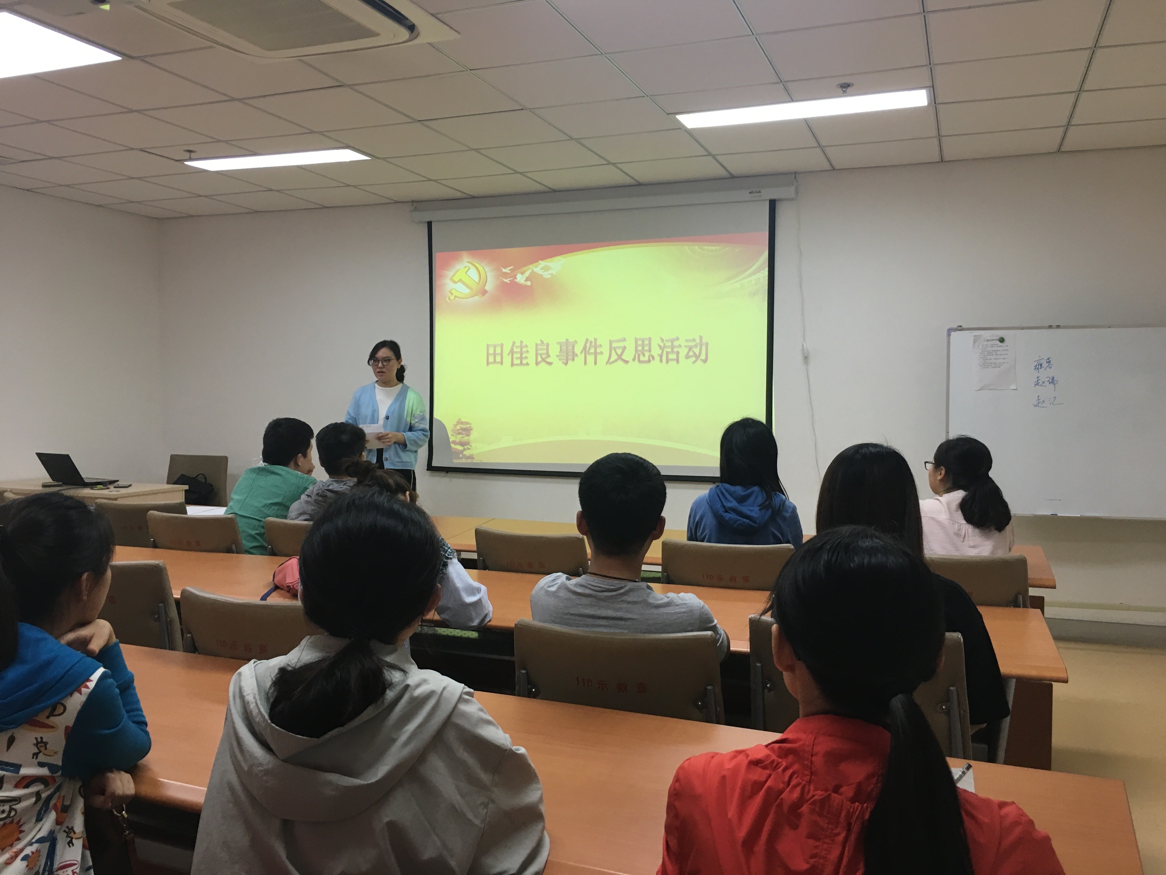 首先,雍蓉向全体党员介绍了“田佳良事件”的始末,着重介绍了事件所产生的不良影响。雍蓉强调,党性党识、理想信念不只是一句空话,我们作为一名学生党员应该时刻注意自己的言行,加强自己的党性修养。之后,与会党员就此次事件展开反思与热烈的讨论。赵瑞同志讲到,民族责任感与民族自豪感是一名党员的基本修养与素质,田佳良在网上发表的“精日”言论,伤害了中国人民的情感,其丢掉了作为一名党员应该具备的立场与原则,党员同志们应该时刻反思自己,谨记自己作为一名党员的责任与义务。展垚通知表示,此次事件性质恶劣,但同时也为大家敲响了警钟,作为学生党员,思想是行动的先导,我们要有坚定的理想信念,不忘初心,肩负起历史使命,做好先锋模范作用。