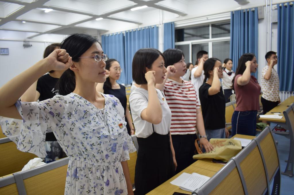 活动最后,蓝湘鑫带领全体党员重温入党誓词,党员们面对鲜红的党旗,佩戴好党员徽章,高举右手庄重宣誓。庄严的宣誓活动,使每一位党员再一次接受了心灵的洗礼。蓝湘鑫做总结发言,对毕业生党员为支部作出的贡献表示感谢并送上毕业祝福,要求毕业生党员在新的人生征程中,时刻牢记自己共产党员的身份,及时完成党组织关系转接任务,在新的工作岗位上注重党性修养,增强党员意识,不负党的重任,不忘初心,继续前行!