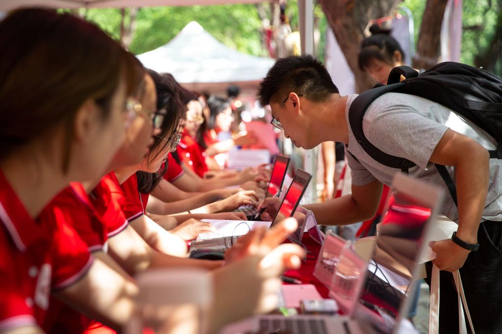 在报到流程区,志愿者们身着统一服装,认真负责地帮助新生办理入学手续,细致耐心地为新生及家长答疑解惑。现场气氛庄重而欢乐,充满热情与生机。