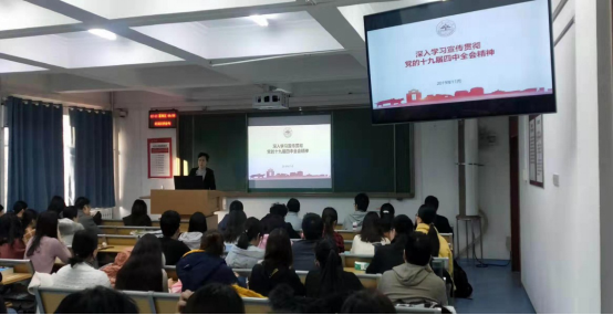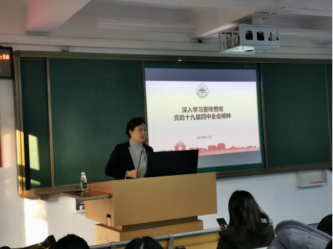 陈子江指出,党的十九届四中全会,是在庆祝中华人民共和国成立70周年之际、实现“两个一百年”奋斗目标历史交汇点召开的一次具有开创性、历史性、里程碑意义的重要会议。习近平总书记在会上发表的重要讲话,具有重大的政治意义和现实意义。学习宣传贯彻习近平总书记重要讲话和党的十九届四中全会精神,将是当前和今后一个时期的重大政治任务。她希望学院能迅速兴起学习宣传贯彻党的十九届四中全会精神热潮,希望同学们能切实用党的创新理论武装头脑,增强贯彻落实的政治自觉、思想自觉、行动自觉。