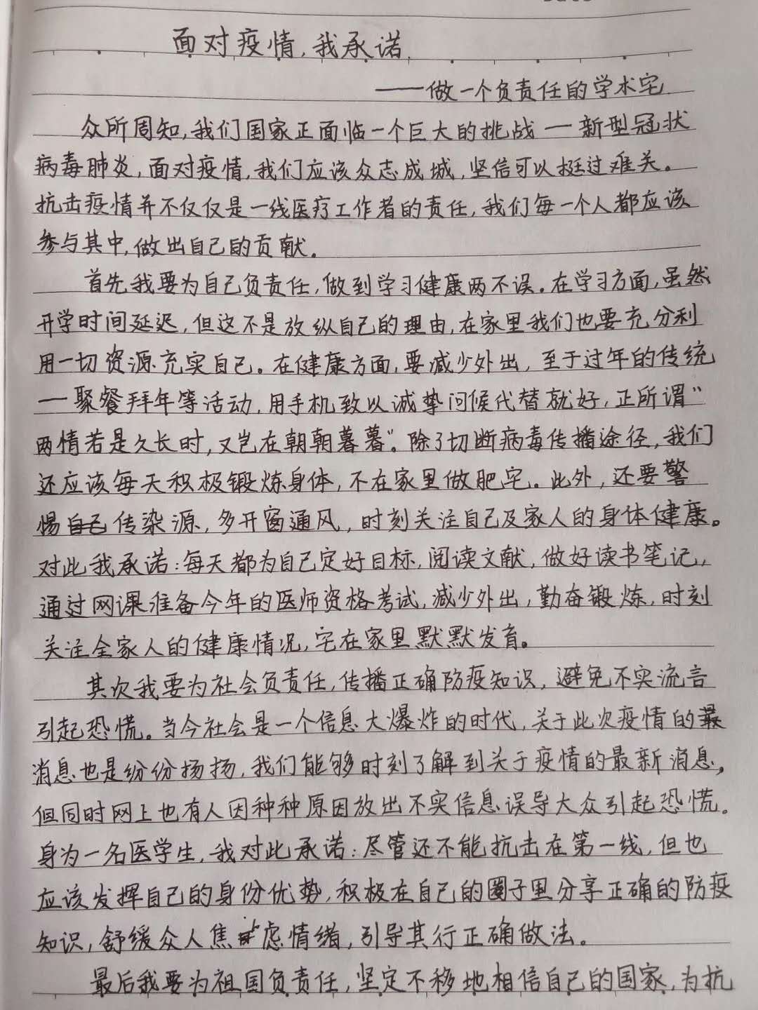 健康承诺,自觉担承防护责任。疫情当前,学院团委组织青年学子以承诺书的形式写下自己的战疫决心。在承诺书中,大家明确表示了自己坚定抗疫、科学防疫的决心,并向武汉同胞及抗疫医护送去最真挚的祝福。承诺书依托学院团学新媒体平台进行宣传发布,在广大青年学子中形成互相监督、互为榜样的积极氛围,凝聚打赢疫情防控阻击战的强大合力。