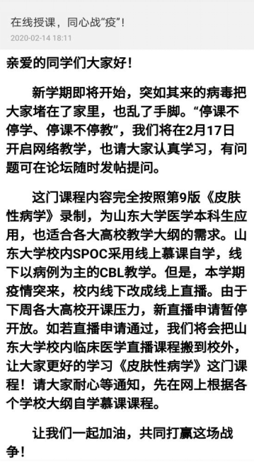 在线授课,同心战“疫”——这是山东大学附属济南市中心医院皮肤科党宁宁主任在本学期开课前面向校内选课学生及上万名网上MOOC学员发布的开课公告,也是疫情发生以来党主任及其教学团队深耕教学的真实写照。