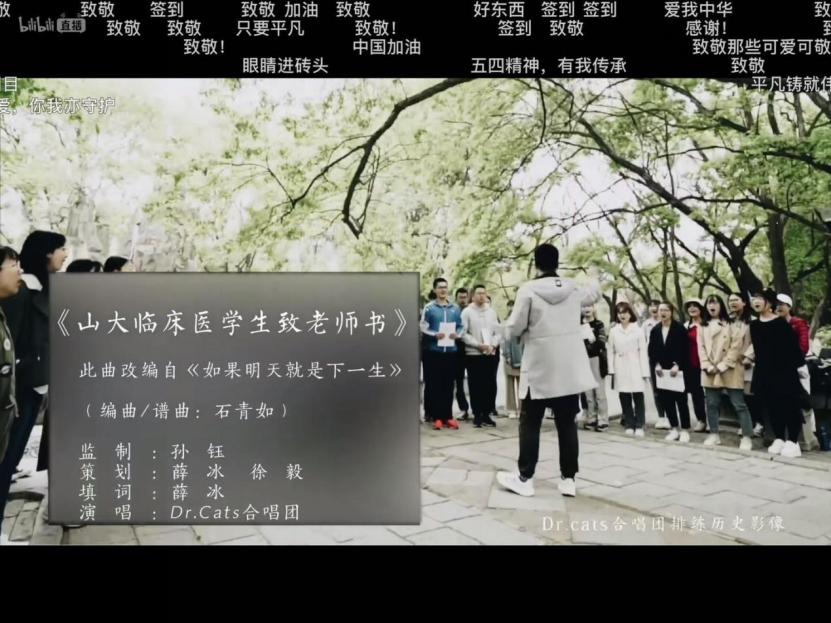 在五四青年节到来之际,5月3日,习近平总书记寄语全国青年:青春由磨砺而出彩,人生因奋斗而升华。为组织青年、教育青年学习贯彻习近平总书记对青年的寄托与期望,5月4日,团中央组织“让青春为祖国绽放”网上主题团日活动,号召全国青年一起感受全国各地团员青年爱国担当、团结奋进的青春风采。主题团日活动在各大网络平台同步举办,山东大学团委推荐、临床医学院策划制作的“云合唱”曲目《一封医学生给老师的信》入选直播作品,在活动的第二篇章“战疫青春”播放,并获得广泛好评。