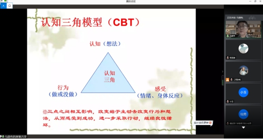 首先,马道伟通过一个故事带领大家一起学习了压力的来源和影响压力强度的因素。接着,他结合一个抑郁症患者的真实案例,为大家重点讲解了“认知、行为、感受”认知三角模型,介绍了认知调节和行为调节两种应对压力的方法。随后,马道伟讲述了压力与情绪的关联以及情绪管理原则,提出了“治标”和“治本”的相结合的应对策略。最后,他向大家介绍了学校心理咨询中心的办公地址和预约方式,表示欢迎有需要的同学到心理咨询中心调整心理状态,呵护心理健康。