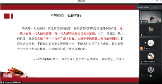 活动伊始,王浩南带领参会团支书敬读人民纪念碑碑文,为大家解读了三段碑文背后丰富的历史内涵与文化价值。随后,王浩南从新民主主义革命与旧民主主义革命的区别、新民主主义革命的主要阶段以及新民主主义革命时期铸就的中国精神三方面展开,讲述了从1919年五四运动到1949年新中国成立30年间发生的重大历史事件,并为大家阐释了这些事件的原因和意义。最后,他鼓励与会同学不忘初心,坚定信念,在实现第二个一百年奋斗目标的历史征程中不畏困难,勇敢前行,为实现中华民族伟大复兴的中国梦贡献青春力量。