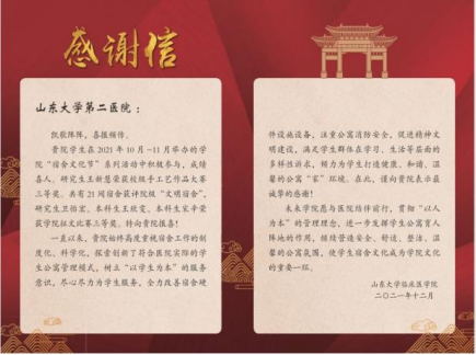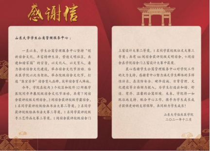 为解决住宿地点分散的难题,学院一直坚持对各附属医院勤走访,与宿舍管理人员常沟通。2021年,学院专门制作感谢信,感谢各医院、学生公寓管理中心长期以来对学院宿舍日常管理的辛苦付出,并尝试搭建更加便携、有效的“沟通反馈平台”。各医院、宿管中心对学院送感谢信的暖心之举表示肯定,也对下一步如何提升管理水平、搭建交流平台交换意见。未来学院将充分发挥平台作用,以此作为宿舍工作的抓手,为宿舍育人阵地建设添砖加瓦。