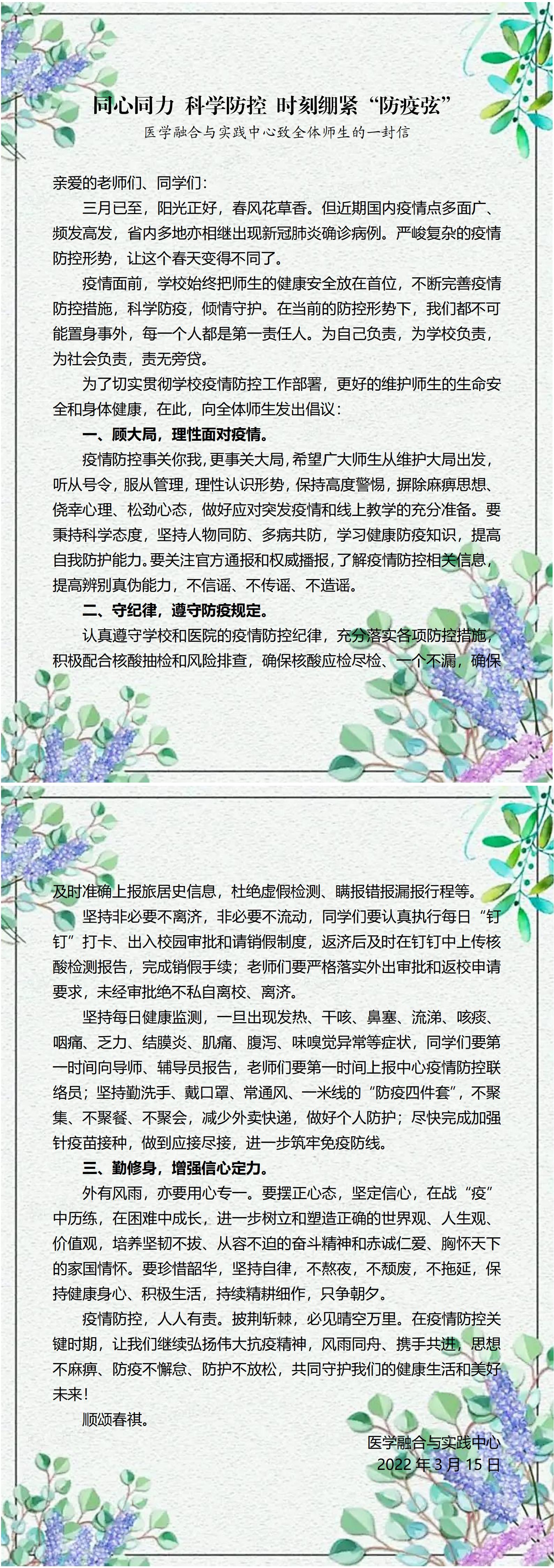 致全体师生的一封信:同心同力 科学防控 时刻绷紧“防疫弦”