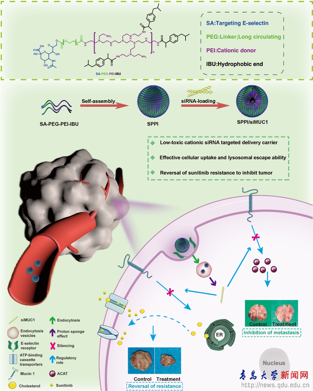 Based on the above research background, Sun Yong's team designed and synthesized a polymer SPPI based on sialic acid, polyethylene glycol, polyethyleneimine, and ibuprofen. Using SPPI to deliver siRNA for targeted gene interference in tumor tissues significantly downregulated MUC1 levels in the tumor tissues, strongly inhibiting cholesterol synthesis in lipid metabolism. This further downregulated the expression of multiple resistance-related proteins such as P-GP, ABCG2, and MRP1 associated with cholesterol efflux, reversing the resistance of tumor cells to the chemotherapeutic drug sunitinib. Additionally, it reduced the secretion of inflammatory factors in the tumor microenvironment, inhibiting tumor metastasis.