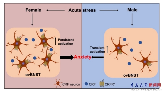 The oval nucleus of the bed nuclei of the stria terminalis (ovBNST) is a critical site regulating anxiety and stress, and rich in stress hormone corticotropin-releasing factor (CRF) and CRF neurons. Previous studies have found that during acute stress, CRF levels in the ovBNST increase, and CRF neurons are activated, while optogenetic inhibition of ovBNST neurons can alleviate anxiety. Interestingly, the ovBNST is also a sexually dimorphic nucleus; anatomical studies have found that the volume of ovBNST in male is twice of that in female, and the female ovBNST contains more CRF neurons than male. Therefore, the ovBNST may play an important role in gender differences in anxiety susceptibility, but the related mechanisms are unknown.