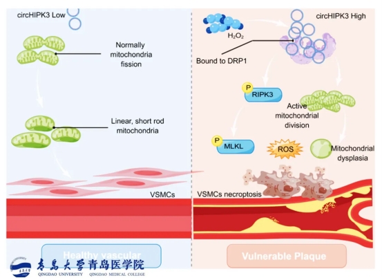 The fibrous cap of the plaque is the main factor for stabilizing plaques, depending on the production of collagen fibers. Vascular smooth muscle cells (VSMCs) secrete collagen fibers, playing a crucial role in the tensile strength of the fibrous cap, thereby being beneficial and necessary for plaque stability. Abnormal death of VSMCs leads to thinning of the fibrous cap, formation of necrotic cores, and plaque calcification, all of which promote the formation of vulnerable plaques. As a recent hotspot in cell death research,necroptosisof cells has been confirmed to exist in the necrotic core of plaques and is closely related to plaque rupture. Circular RNA (circRNA), as a special class of non-coding RNA molecules, has a unique closed-loop structure that is less susceptible to RNase degradation, thus being more stable in expression. However, its regulatory role in thenecroptosisof VSMCs has not been fully explored. This study unveils the role of circRNA in thenecroptosisof VSMCs, particularly in the context of atherosclerosis and the appearance of vulnerable atherosclerotic plaques. CircHIPK3 directly affects the mitochondrial dynamin-related protein 1 (DRP1) in VSMCs, leading to an abnormal increase in mitochondrial fission and ROS production, ultimately causing cellnecroptosisand the formation of necrotic plaque cores. The elucidation of this pathway not only provides a molecular explanation for the progression of atherosclerosis but also highlights the potential of circHIPK3 as a novel biomarker for diagnosing and therapeutically intervening in this cardiovascular pathology.